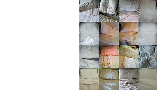 Notes: Various souls, from between the sheets of 100 beds, poised before the same exit. The photographs of beds were taken according to instruction and mostly emailed to the author, coming courtesy of friends, colleagues and neighbours.