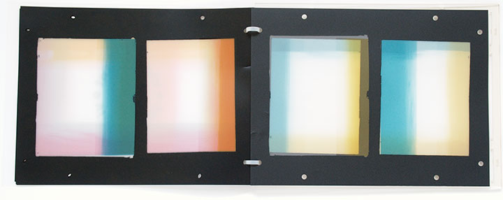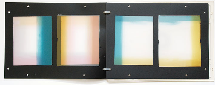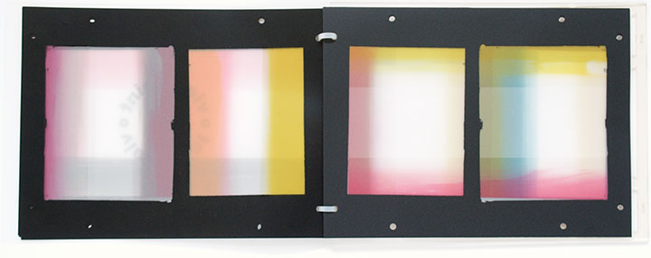 Format: 16 pages; 12 pages screenprinted by the author on polycarbonate film, with 4 blanks. Pages, 21.5 x 29cm. Frame, 22.5 x 30cm.